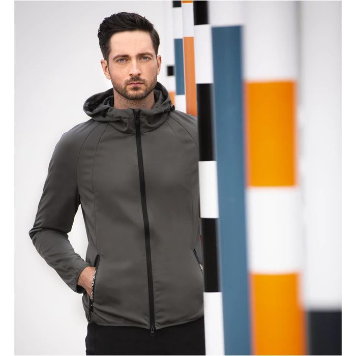 Sporty athleisure men’s jacket made of bi-elastic softshell with comfortable 4-way stretch for best freedom of movement. Its functional diversity impresses with a fast-drying, highly wind- and water-repellent outer material, which in no way affects the excellent breathability. The OSKAR also has waterproof zips with attractive print labeling. The sporty seams, raglan sleeves, and prints in a matt look optimally emphasise the athleisure look. Includes a hood that can be adjusted with an integrated zipper.
