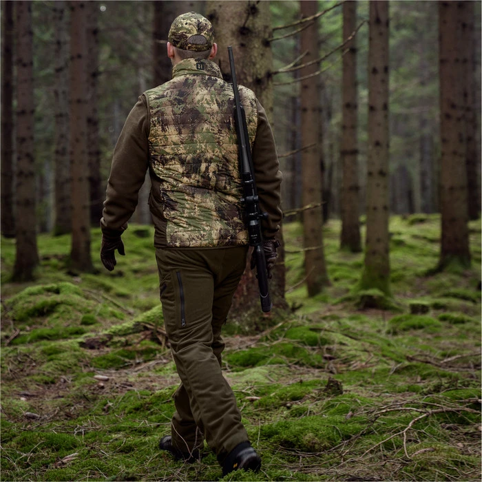 The Deer Stalker camo reversible waistcoat is the perfect addition to your deer stalking kit. The waistcoat features our AXIS MSP® Forest camouflage on one side and a solid green colour on the other side. The waistcoat is rather light and can provide you with added insulation on those cold morning outings during the spring or serve as a mid-layer during your autumn and winter stalks. The waistcoat is packable into its own pocket making it ideal to bring with you and put on in case you get cold or if your activity level changes. The fabric is treated with a DWR-coating making it water- and dirt-repellent and thereby offering you some weather protection if you are caught out in the rain.