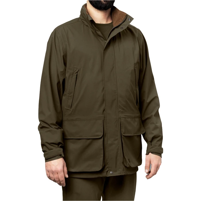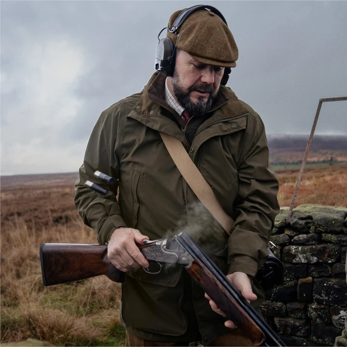 The Orton Classic Shooting jacket is made from a laminated outer fabric with an HWS® membrane. This makes it windproof and waterproof. For really bad weather, there is a practical, packable hood to keep the rain and strong winds out. The hood is adjustable so as to allow a cap to be worn underneath. There are superb handwarmer pockets, and large front paockets with quick-load straps for holding the flaps open to keep them out the way when reloading while bird shooting. There is also a neat Napoleon pocket and an inner pocket to protect your mobile. The classic fit of the jacket can be adjusted by means of drawstrings at the waist and bottom hem.