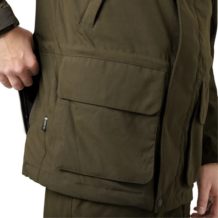 The Pro Hunter Shooting GTX jacket takes all of the tried and tested features of our iconic Pro Hunter range and put them to good use in this shooting jacket. Made from the highly durable and hardwearing Airtech® fabric, the Pro Hunter Shooting jacket is great for rough terrain and dense forest which works well for beaters and shooters in situations where a full tweed suit might be too classic. The jacket has a wind- and waterproof GORE-TEX membrane that will keep you dry during wet days. The shooting jacket has a classic cut that is a bit different from our other Pro Hunter styles to make it fit in perfectly on a classic shooting day. It has an detachable hood, adjustable cuffs as well as handwarmer pockets.